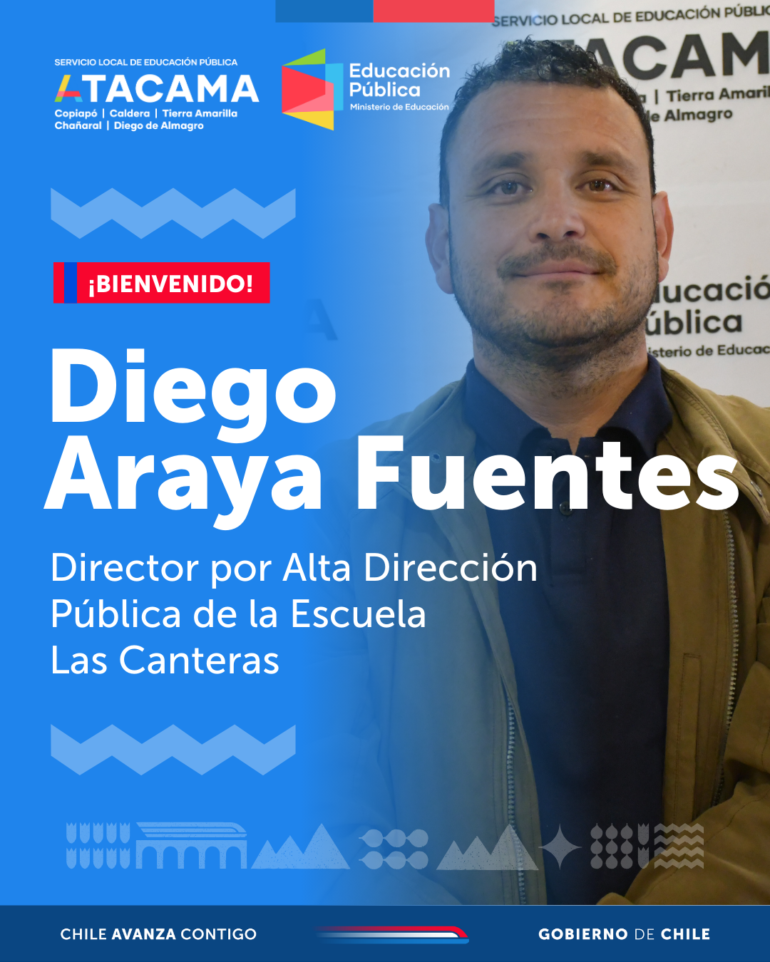 El Servicio Local de Educación Pública Atacama informa que Diego Araya Fuentes asumirá la dirección de la Escuela Las Canteras de Copiapó, en el marco de los procesos regulares de provisión de cargos directivos que se desarrollan en el sistema de educación pública.